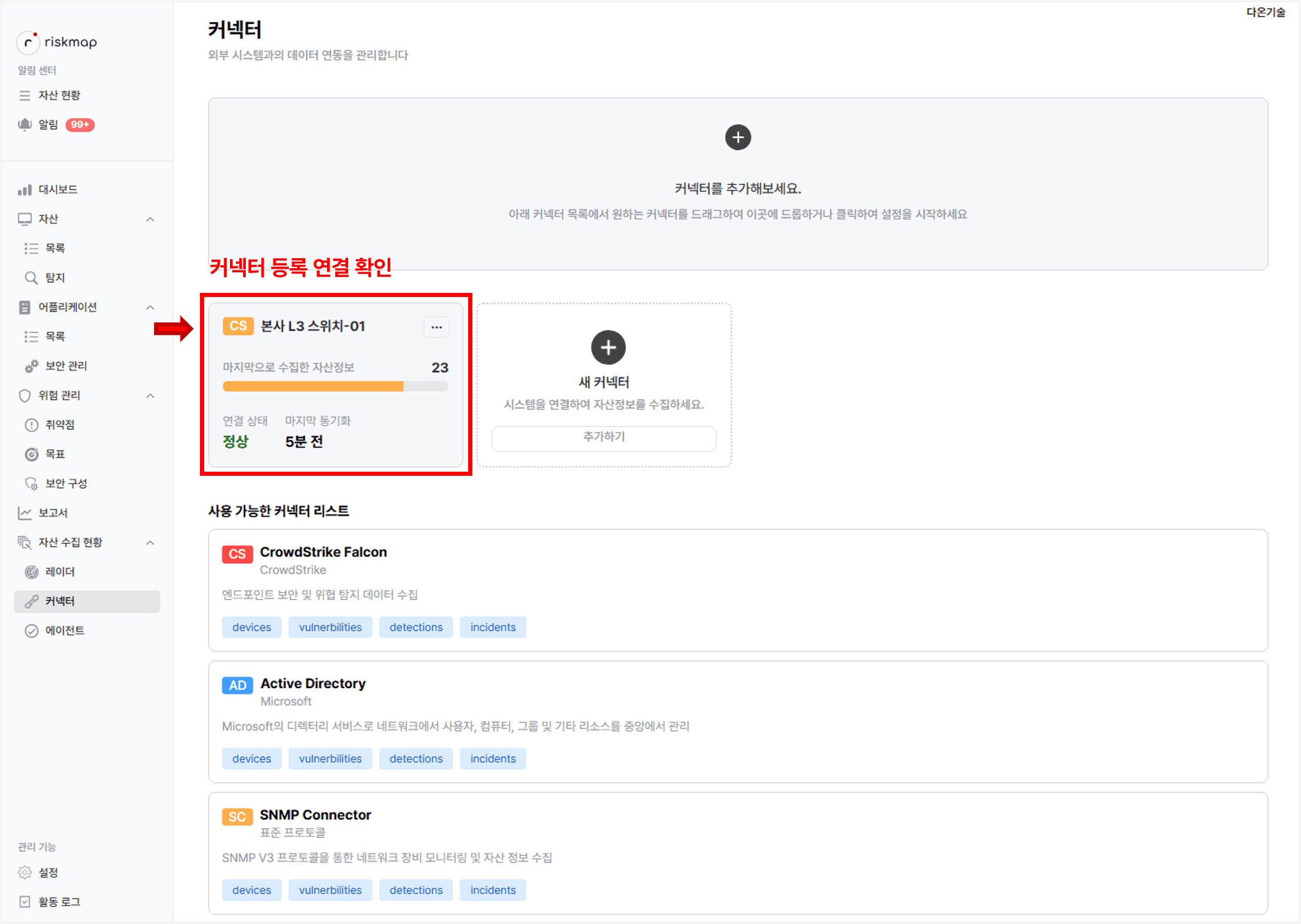 커넥터 추가 생성 | 리스크맵 매니저에 접속 후, 자산 수집 현황 커넥터 메뉴에서 커넥터 추가하기 또는 사용 가능한 커넥터 리스트에서 드래그앤 드롭으로 설정을 진행합니다. |