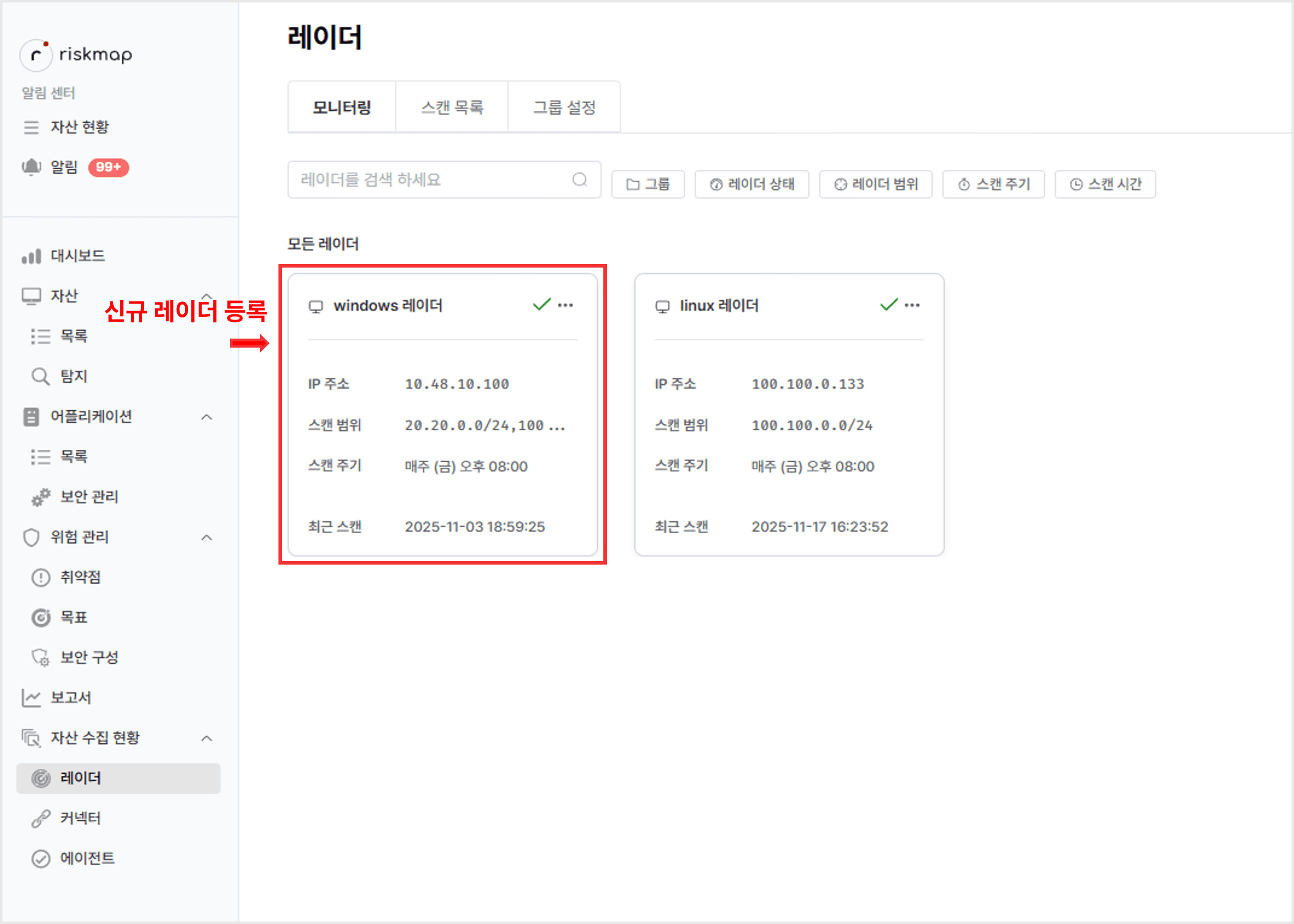 Windows / Linux 레이더 설치 완료 후, 리스크맵 매니저에 접속하여 레이더 목록에 추가되었는지 확인합니다.